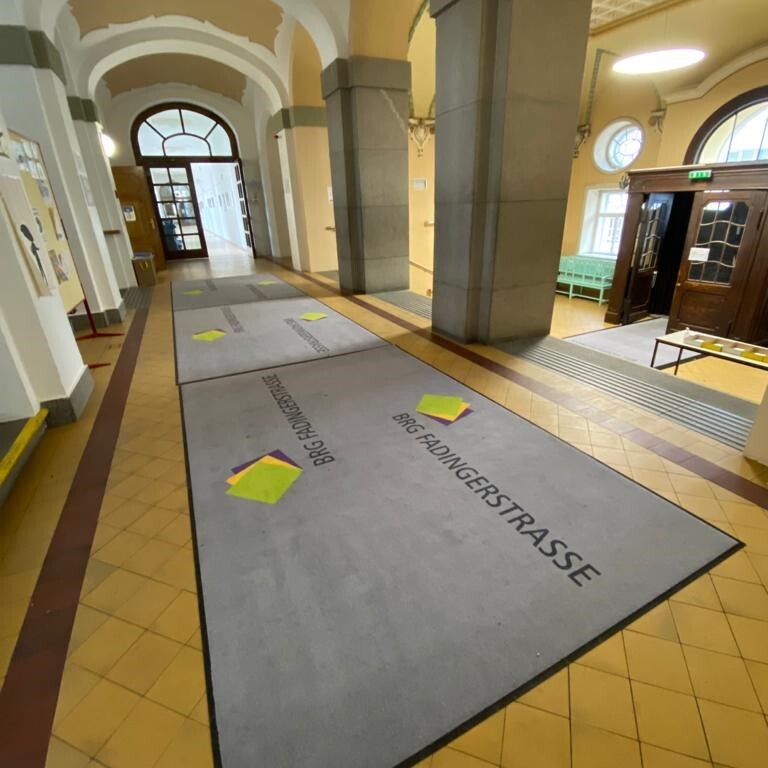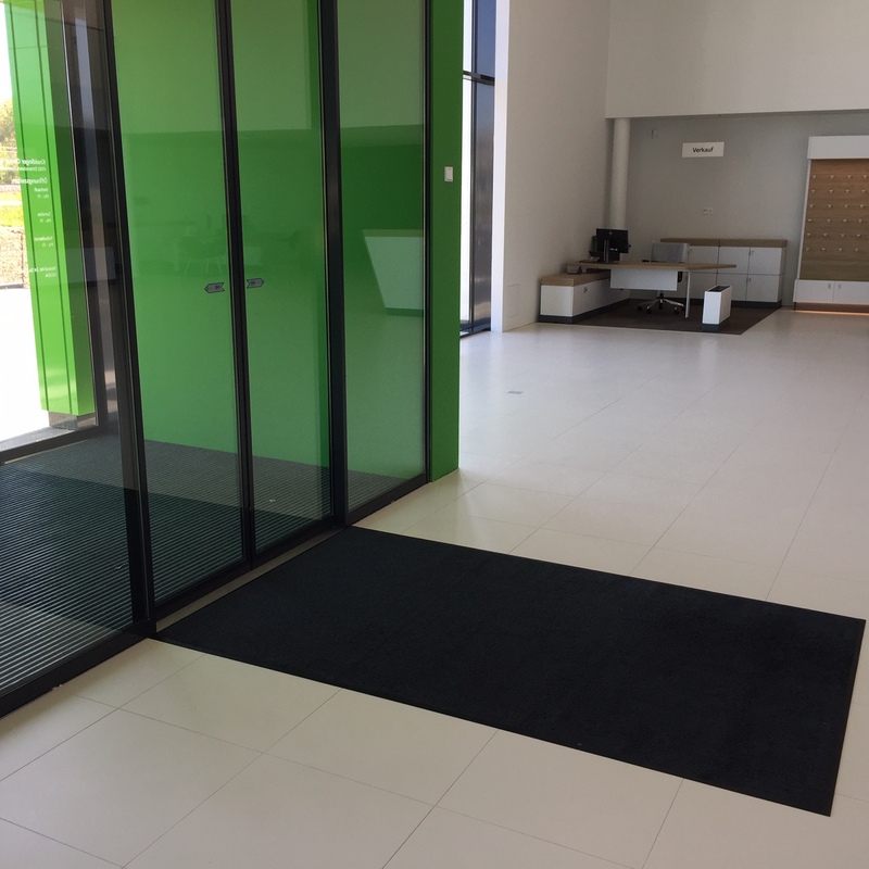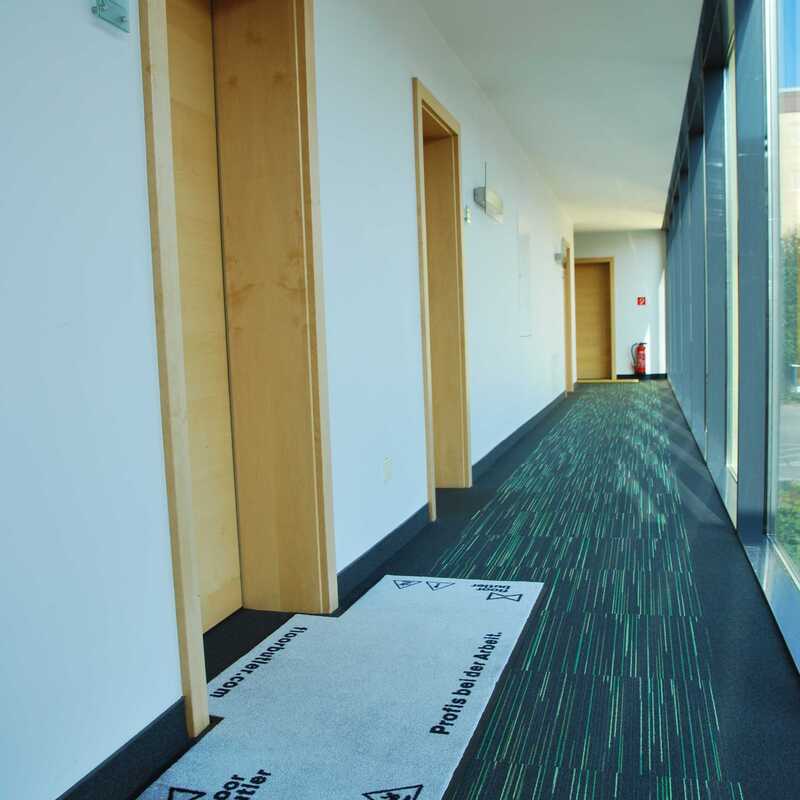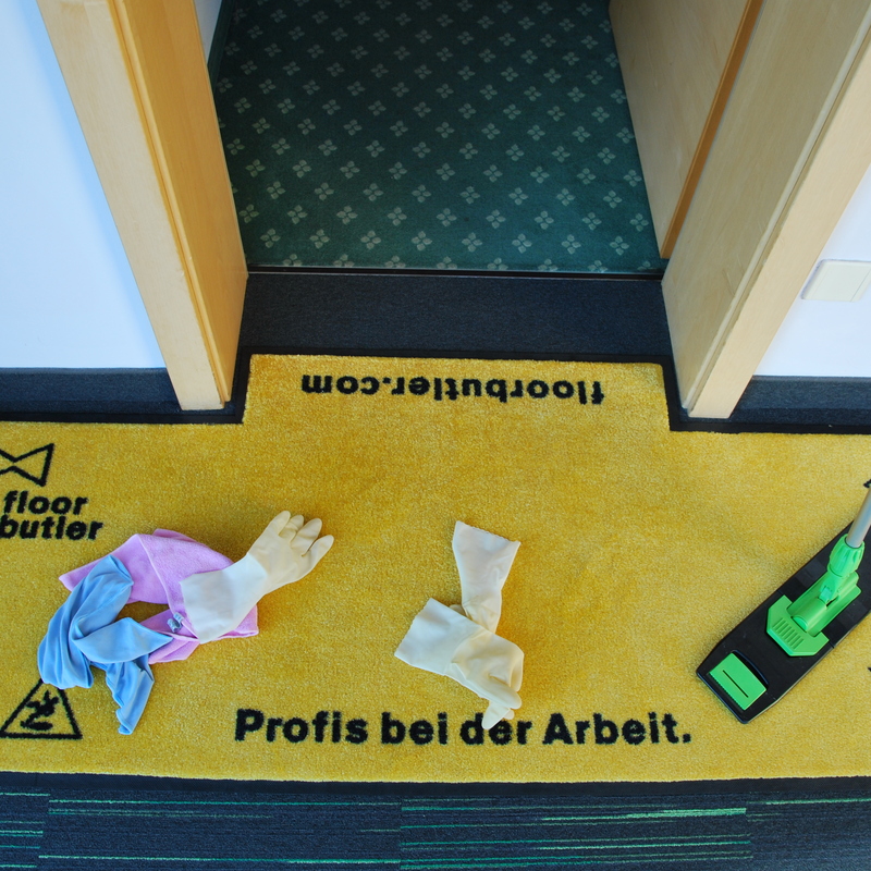 Sicherheits-, Schmutz- und Servicebodenmatte für Servicekräfte, House-Keeping, Handwerker, Dienstleister und Gebäudereiniger. Die Matte dient zum Abstellen, Zwischenlagern und Reinigen von Hilfsmitteln bei der Reinigung und Servicierung von Räumen und Bodenflächen. Es entsteht eine eindeutig mit Warnzeichen markierte, rutschfeste Servicefläche. Weiters dient die Matte als Schutz des Untergrunds vor Beschädigung und Verschmutzung. Die einzigartige Lasche lässt die Matte in den Türstock gleiten und ermöglicht einen sicheren und sauberen Übergang vom Raum auf die Matte. (floorbutler ist eine geschützte Wort- Bildmarke und besitzt einen Gebrauchsmusterschutz)