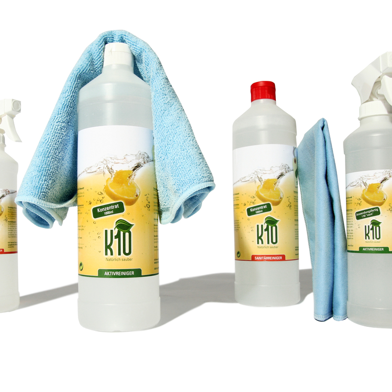 Die Produktlinie K10 besteht aus einem Allzweckreiniger, einem Sanitärreiniger und einer Reinigungsmilch für Edelstahl und alle abwaschbaren Oberflächen. Es sind weltweit einzigartige Reiniger für sämtliche Materialien und Oberflächen. K10 als natürliches ph neutrales Reinigungsmittel verzichtet gänzlich auf die herkömmliche Reinigungschemie, Alkohol, Lösungsmittel, Seifen usw. und wirkt ausschließlich durch naturidentische Lebensmittelzusatzstoffe wie Zitrone.